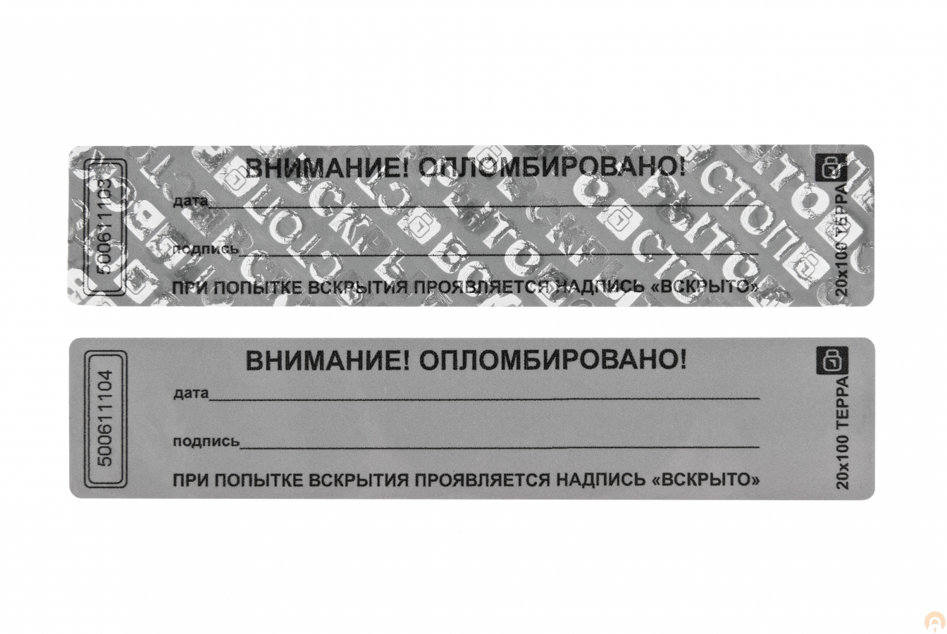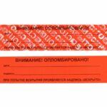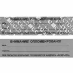 Представляет собой самоклеющуюся этикетку на специальной подложке, выполненную из полиэстера с высокоадгезивным клеевым слоем. При попытке отклеивания от опломбируемой поверхности проявляются надписи «ВСКРЫТО», «СТОП» и знак производителя, не исчезающие при повторном наклеивании. Наклейка не оставляет следов на опломбируемой поверхности. Каждая наклейка имеет свой индивидуальный номер, что исключает возможность подмены. Двойной контур защищает номер от стирания и подделки трафаретом. Содержит поля «дата» и «подпись» для удобства в работе.