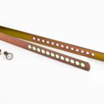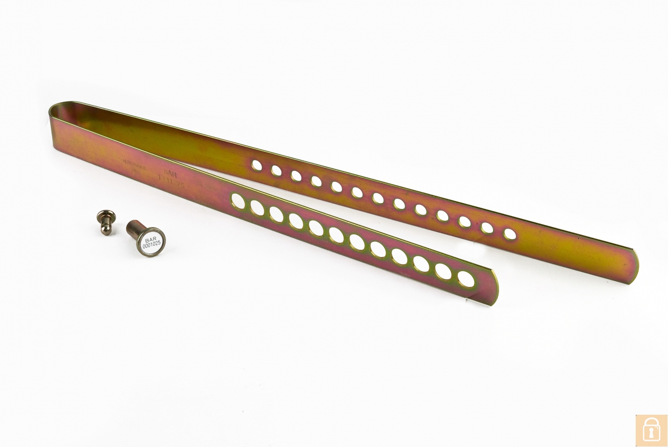 - Изделие «Трэксил» — высокопрочная стальная скоба размером 555×35 мм и толщиной 2 мм, имеет монтажные отверстия, перфорированные на грани пломбы, облегчающие подбор оптимального посадочного размера для установки;