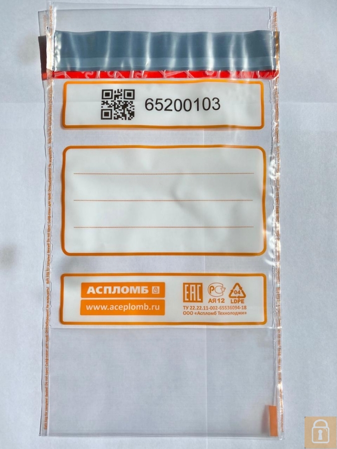 Сейф-пакет представляет собой прозрачный пакет, на который нанесен индивидуальный номер. Заклеивается номерной сейф-лентой, при попытке вскрытия клапана на сейф-ленте проявляется надпись «Стоп вскрыто!»