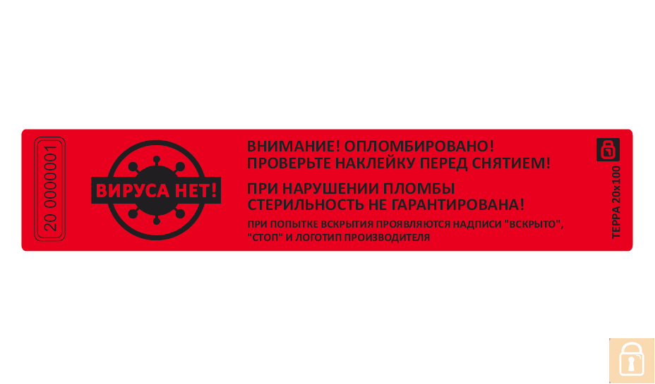 Пломба Терра «ВИРУСА НЕТ!» 20×100 мм актуальна медицинским компаниям, службам курьерской доставки — всем кто заботится о безопасности своих клиентов, наклейка гарантированно выявляет попытки вскрытия, оставляя характерный след на опечатанном оборудовании, таре, имуществе